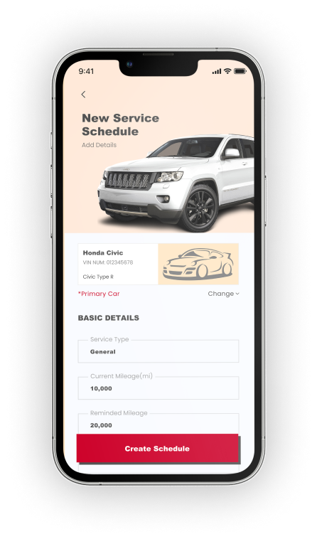 This feature includes Service type, current Mileage, reminded mileage, date, add services(s), additional notes etc.