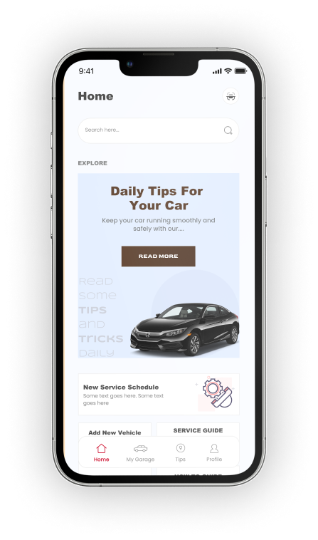The center section of the app, comprises Banner Ads, Create new Service Schedule, Add New Vehicle, Service guide, How to guide and My Vehicles.